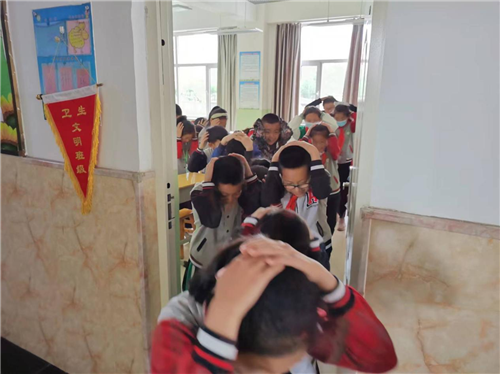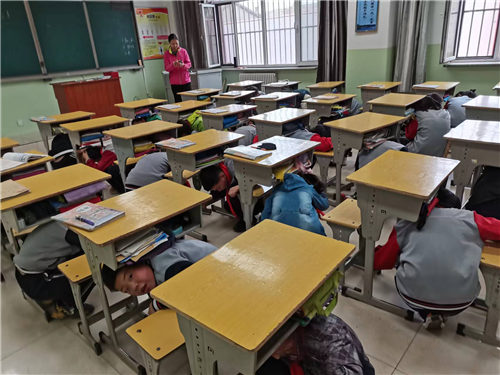 防震演练前,各班班主任对学生们进行了演练培训,讲解了演练流程。伴随模拟地震警报响起,防震演练开始了。教师们根据事先的安排快速到位,镇北社区工作人员指挥学生们立即寻找“安全三角区”,做好防护措施,身体蹲下,双手护头,进行躲避。听到疏散的信号后,老师告知同学们,“地震了,不要慌,马上有序、快速撤离教室。”学生们按指定路线迅速撤离至学校操场的指定地点。随后各班班长清点人数并逐级汇报。整个演练过程秩序井然,全体师生配合默契,圆满完成。